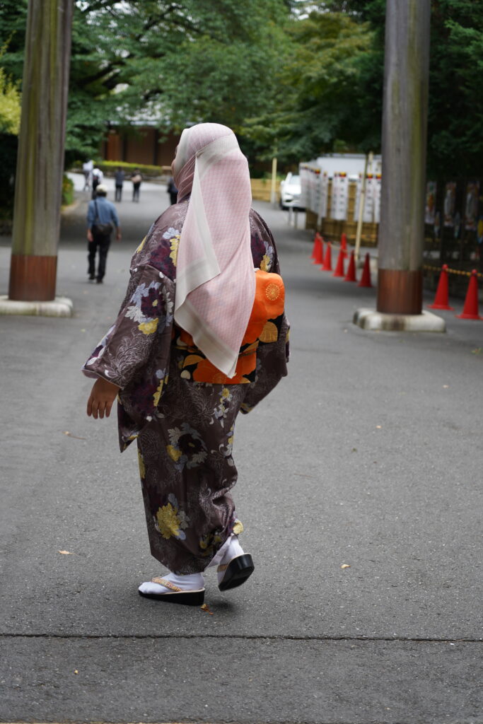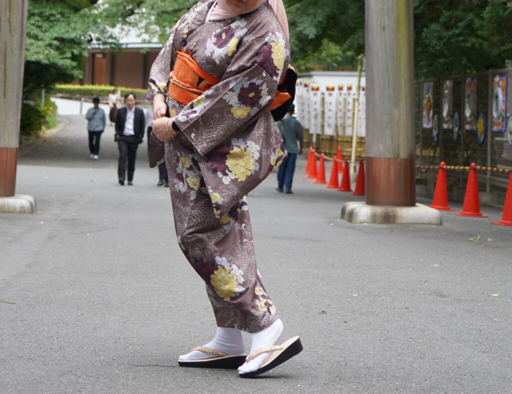 This plum-purple iromuji (single color kimono) has an interesting, hidden detail–a striped pattern on the lining that, when worn, is visible from certain angles so looks used for Japanese dance. Because it is just a single color, the possibilities for coordination are endless! We paired it here with a colorful, floral Nagoya obi with metallic gold outlines. The obi is …