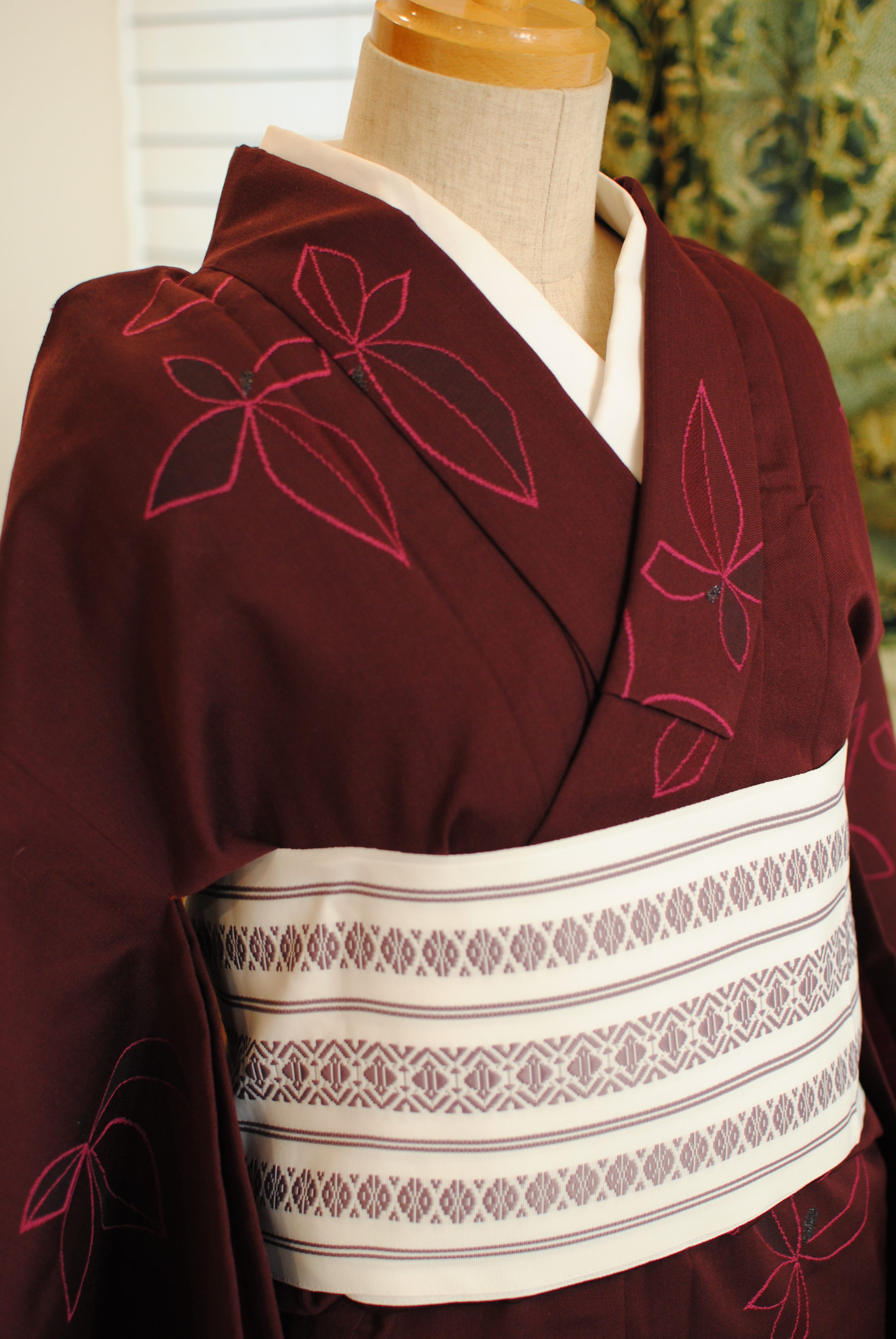 A very interesting kimono! The pattern and colors are reminiscent of the 70s and not for the faint of heart. Because it is wool, it can easily be dressed more casually as in this set. We paired it with this deep purple hanhaba kobukuro obi which creates a nice balance of colors. The obi has pink on the reverse side.